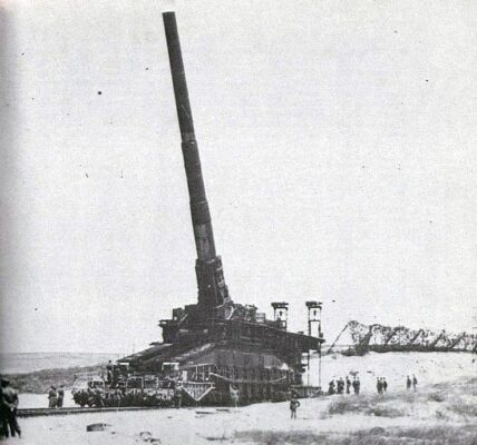 Eisenbahngeschütz Schwerer Gustav auf einem seltenen Foto, wahrscheinlich irgendwann im Jahr 1942 in Sewastopol, obwohl diese Information nicht zu 100 % bestätigt werden kann. Der „Schwere Gustav“ war das schwerste mobile Artilleriegeschütz, das je gebaut wurde, und die größte gezogene…