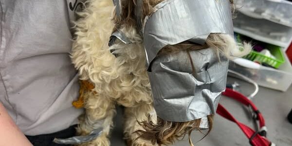 Hund in Müllcontainer gefunden, eingewickelt in Klebeband